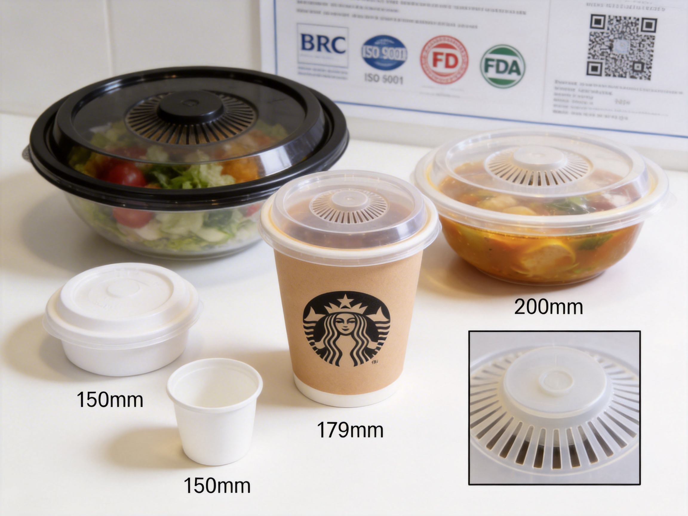 The clear PP plastic ordinary vented lid holds certifications from globally recognized bodies, verifying its quality and compliance: QS National Industrial Product Production License (China), ISO 9001 Quality Management System, BRC Global Standards for Packaging, German DIN Safety Certification, and EU ROHS+ Testing. These certifications confirm that the product meets strict safety, quality, and environmental standards.
